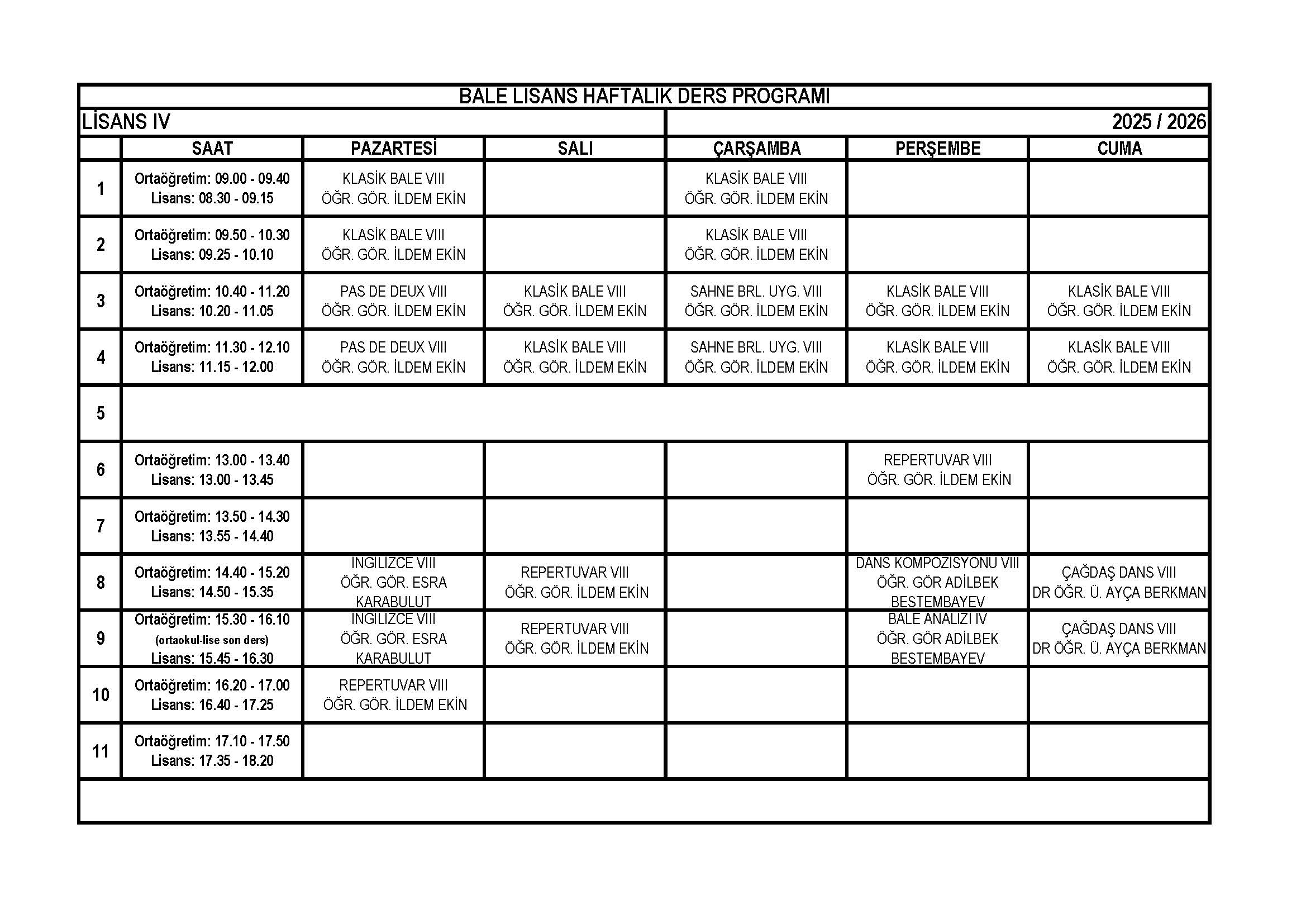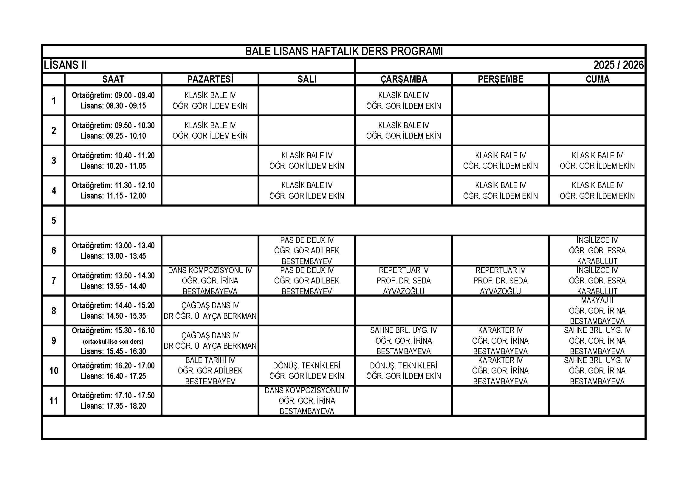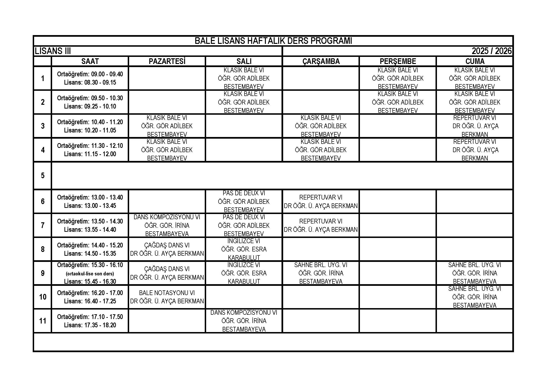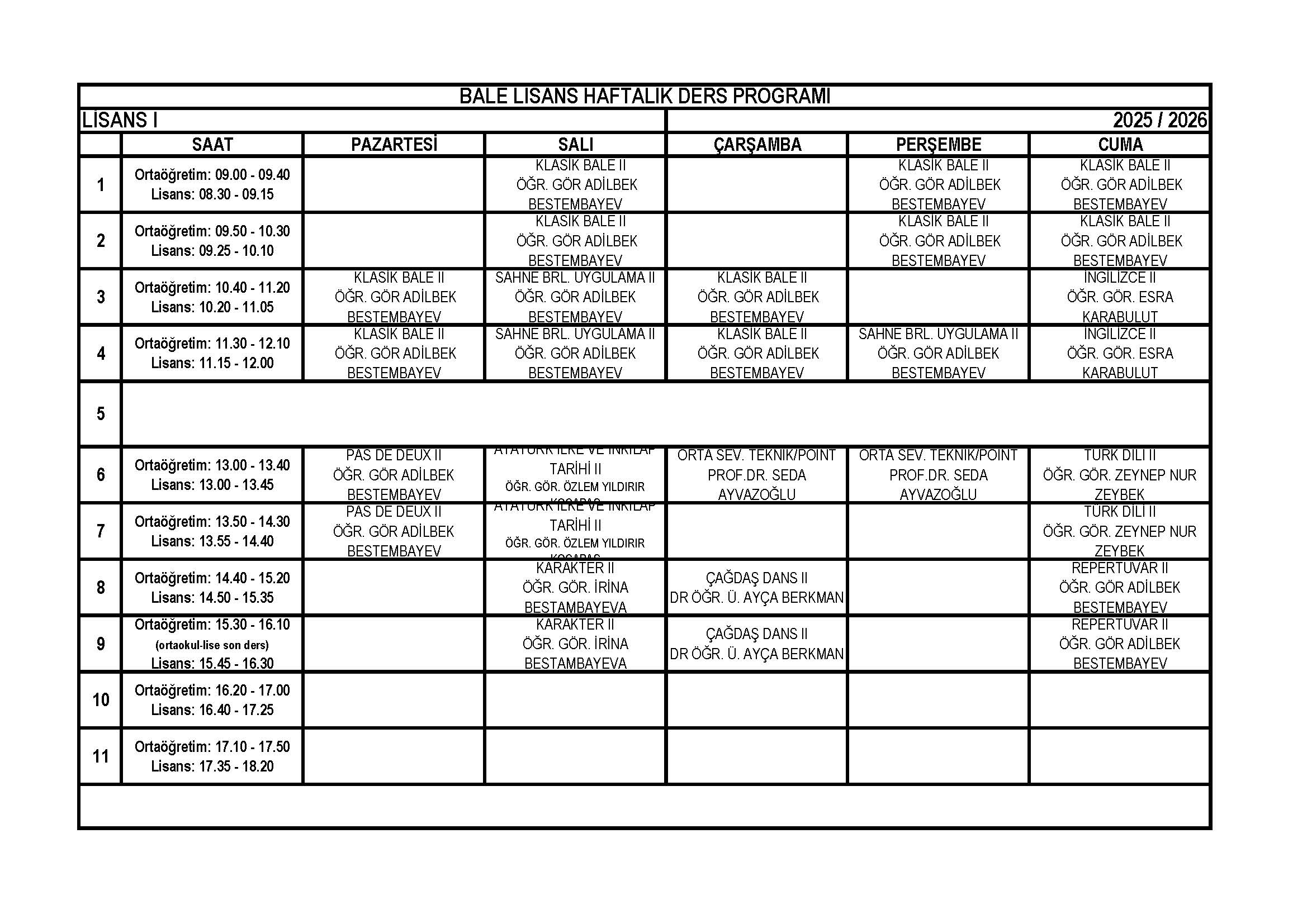 | Bale Lise 11. Sınıf Haftalık Ders Programı |
