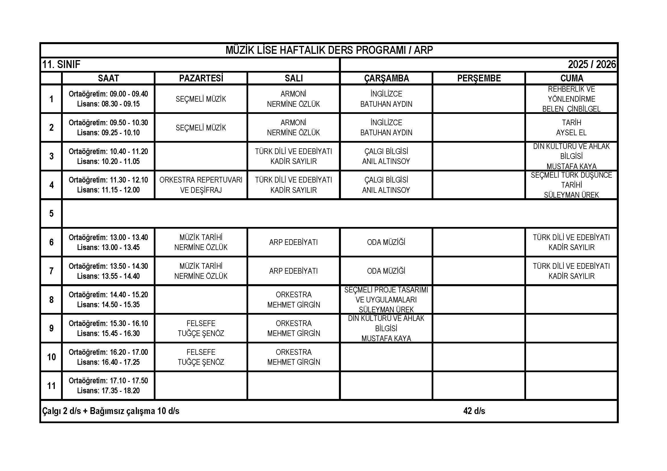 Arp Lise 11. Sınıf Haftalık Ders Programı
