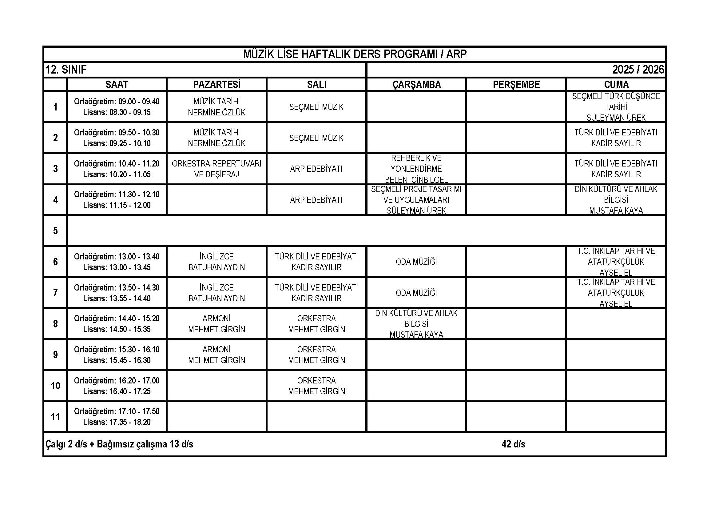 Arp Lise 12. Sınıf Haftalık Ders Programı