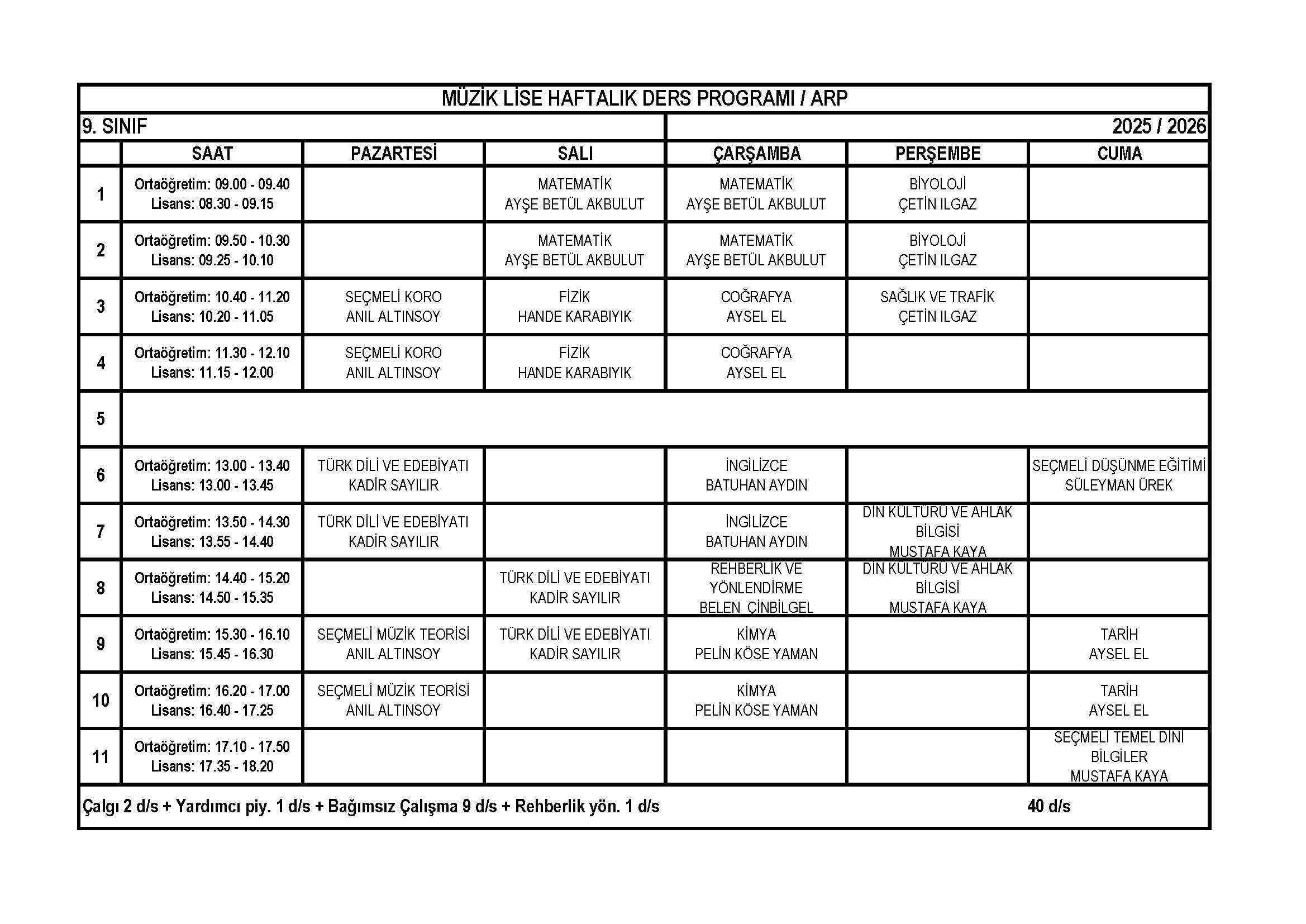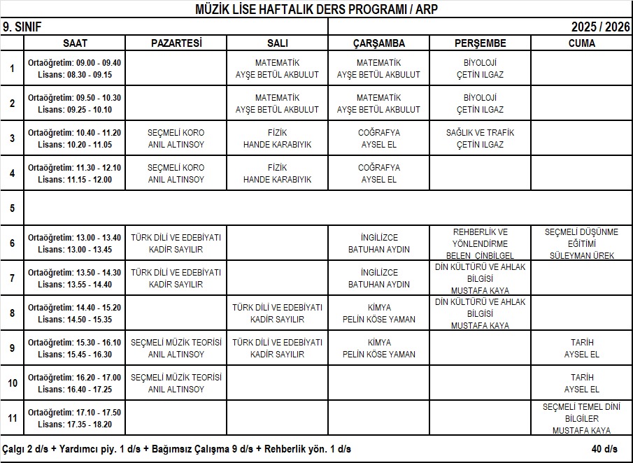 Arp Lise 9. Sınıf Haftalık Ders Programı