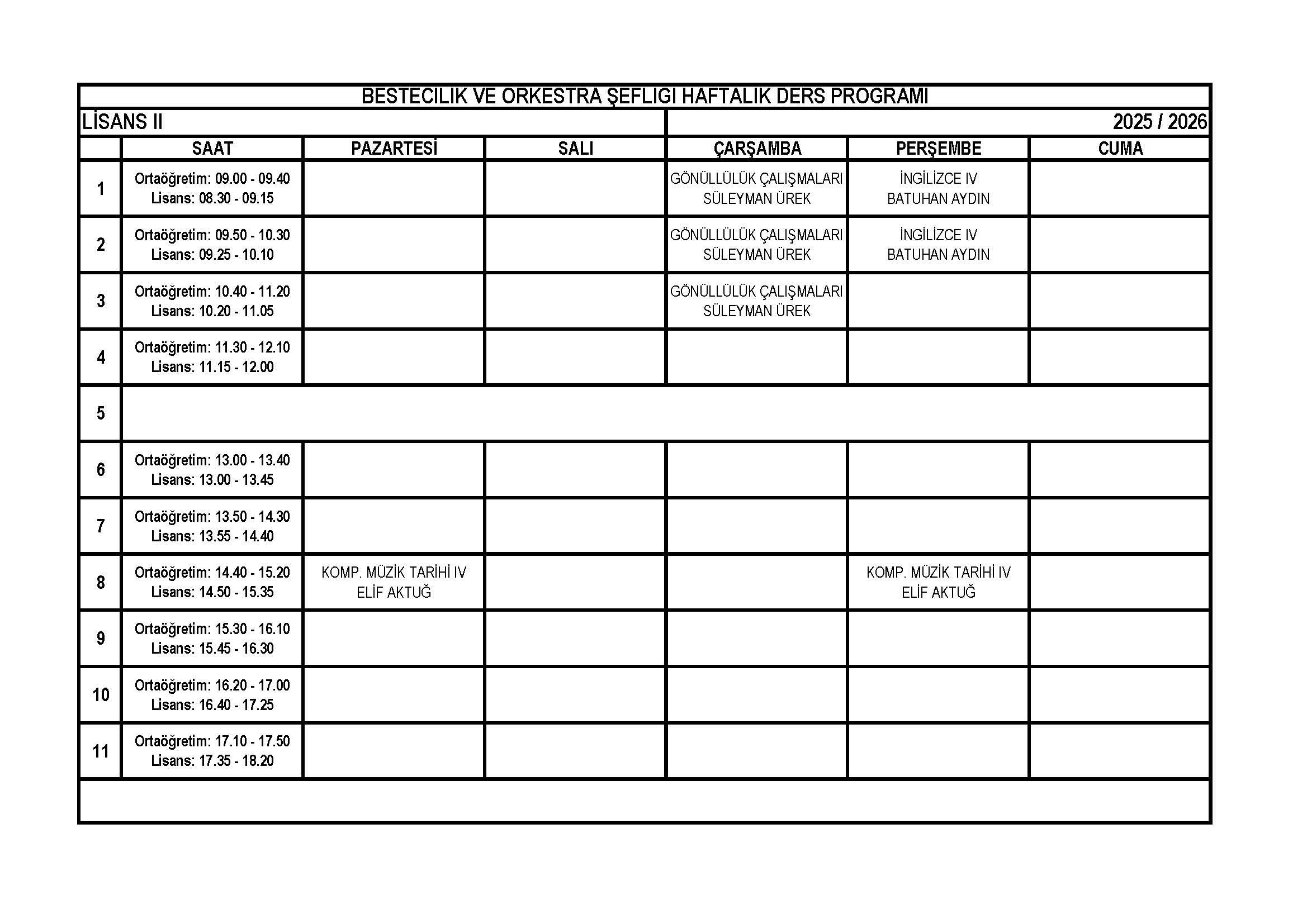 Bestecilik ve Orkestra Şefliği Lisans 2. Sınıf Haftalık Ders Programı