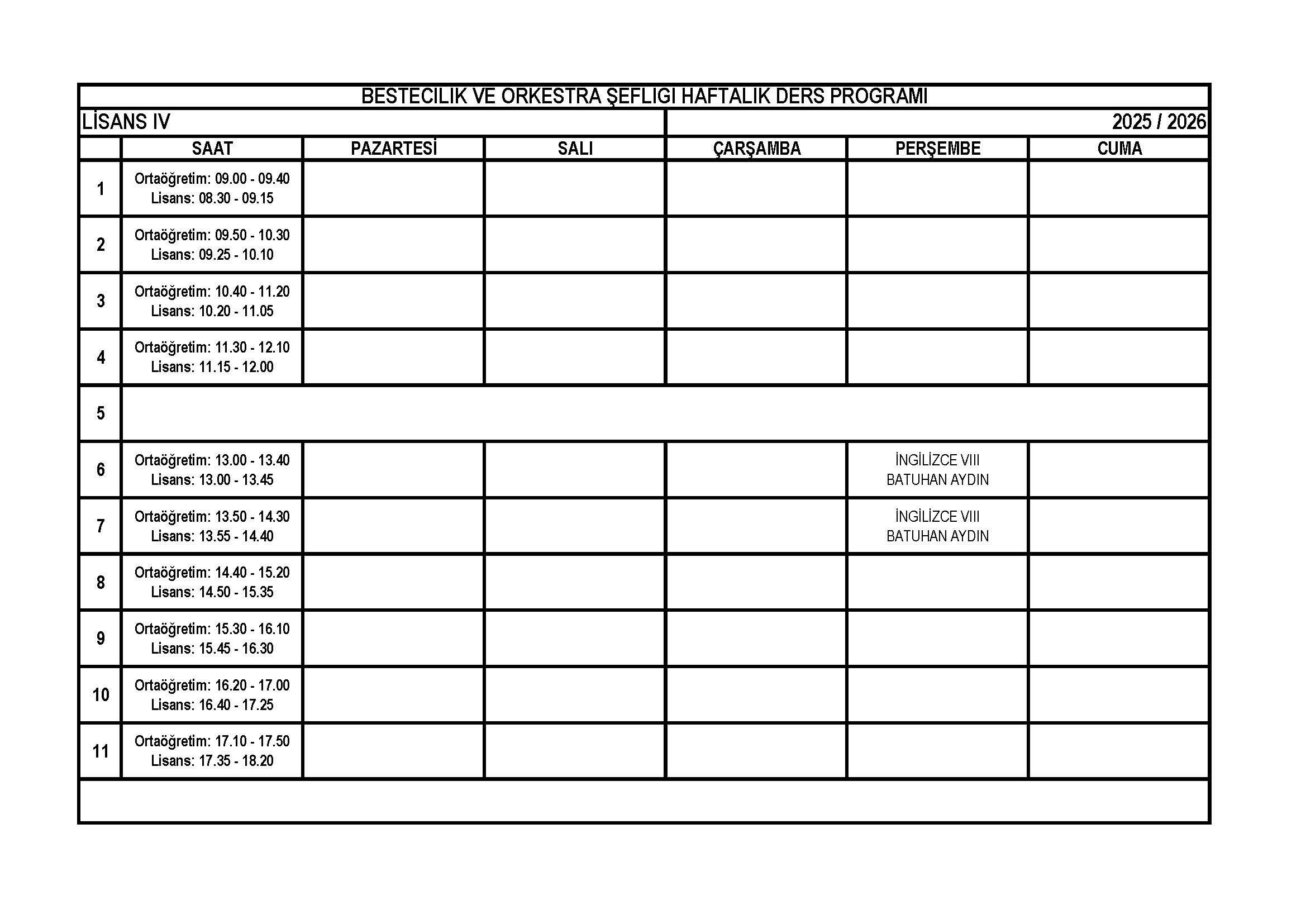Bestecilik ve Orkestra Şefliği Lisans 4. Sınıf Haftalık Ders Programı