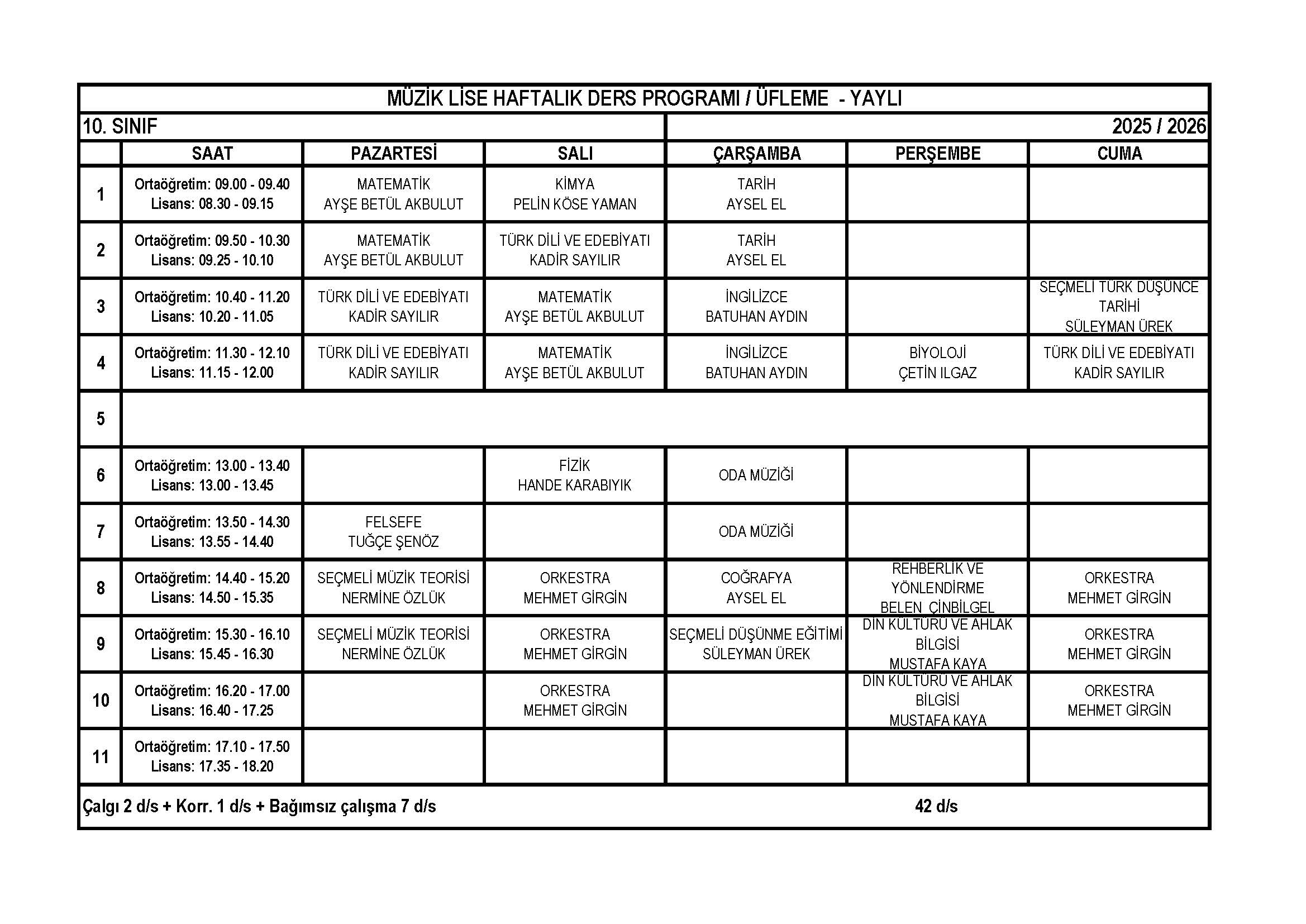MÜZİK VE SAHNE SANATLARI LİSESİ HAFTALIK DERS PROGRAMLARI