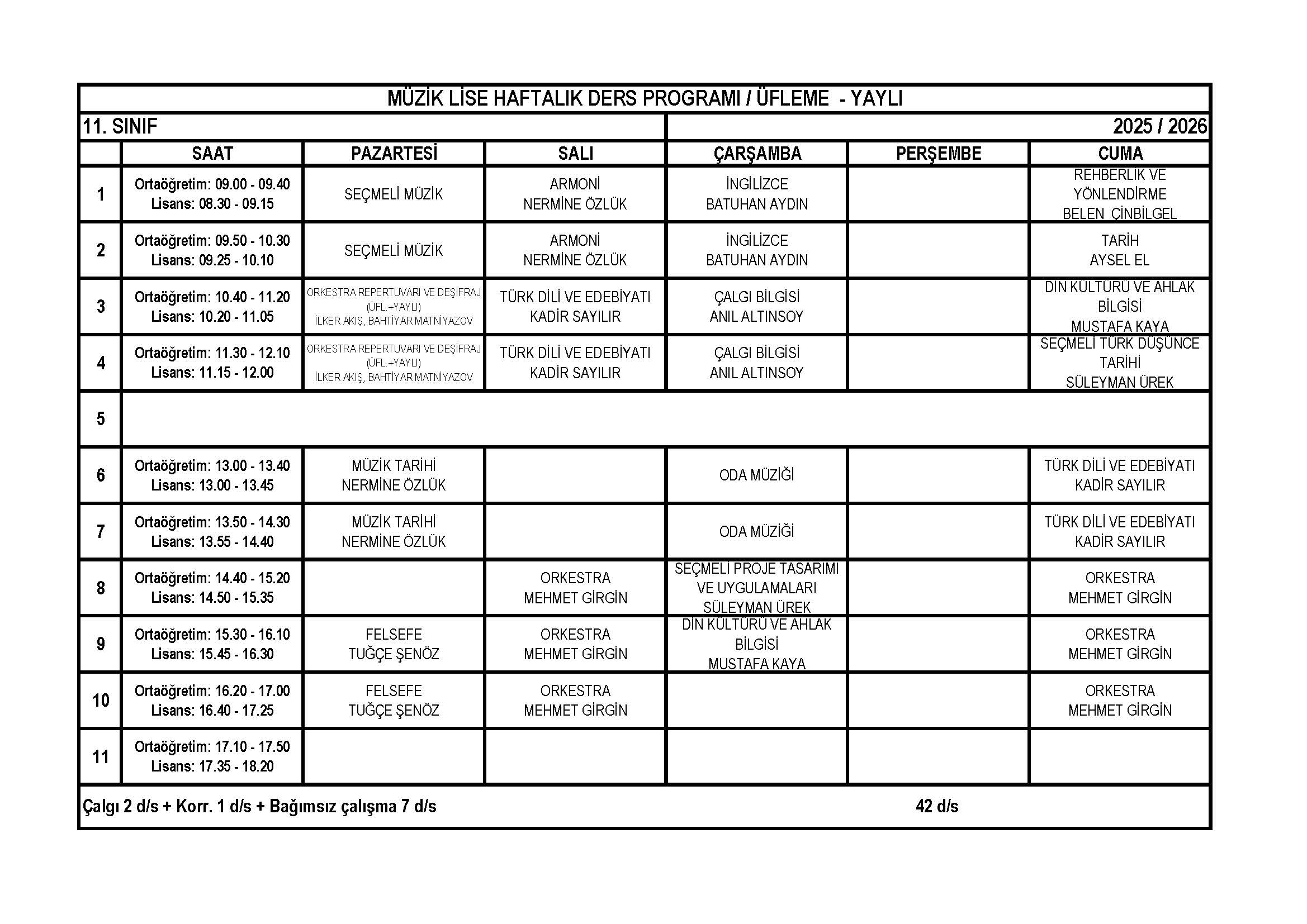 Üfleme – Yaylı Lise 11. Sınıf Haftalık Ders Programı