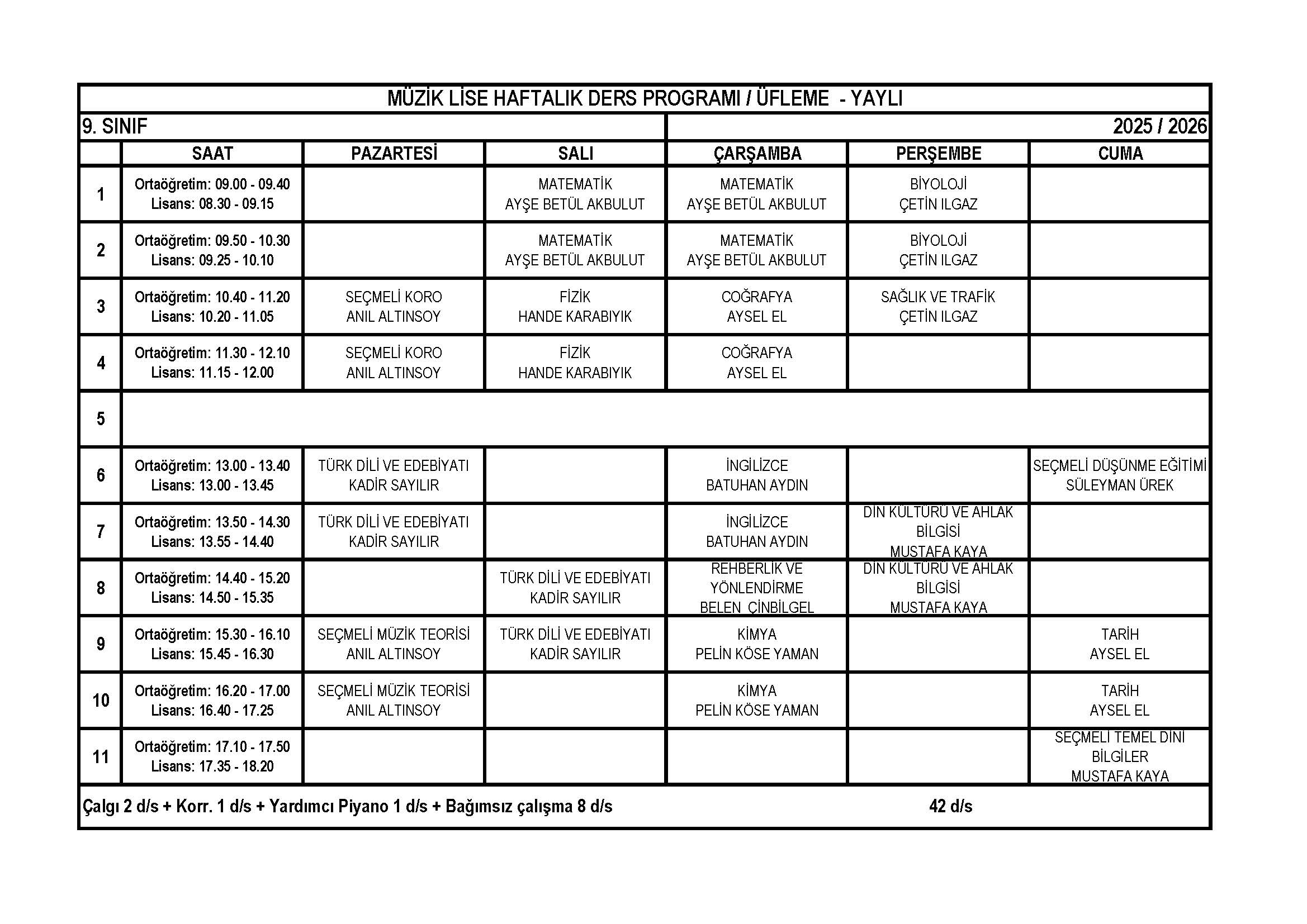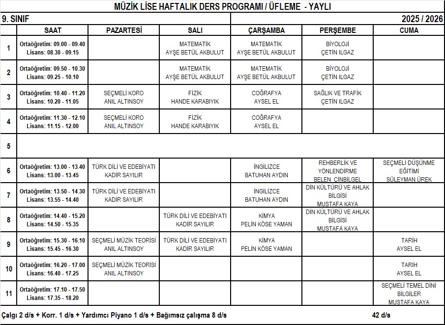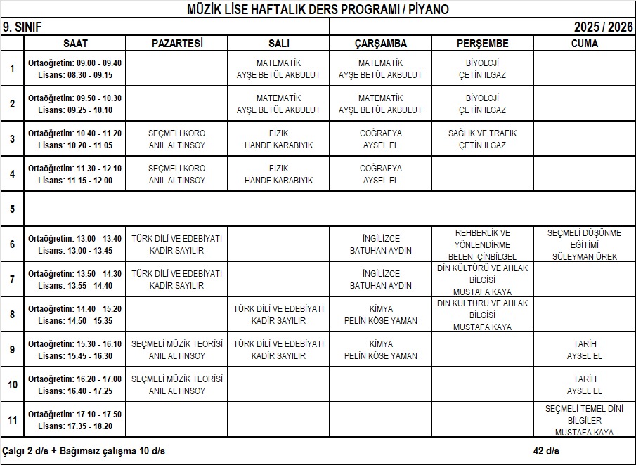 Piyano Lise 9. Sınıf Haftalık Ders Programı