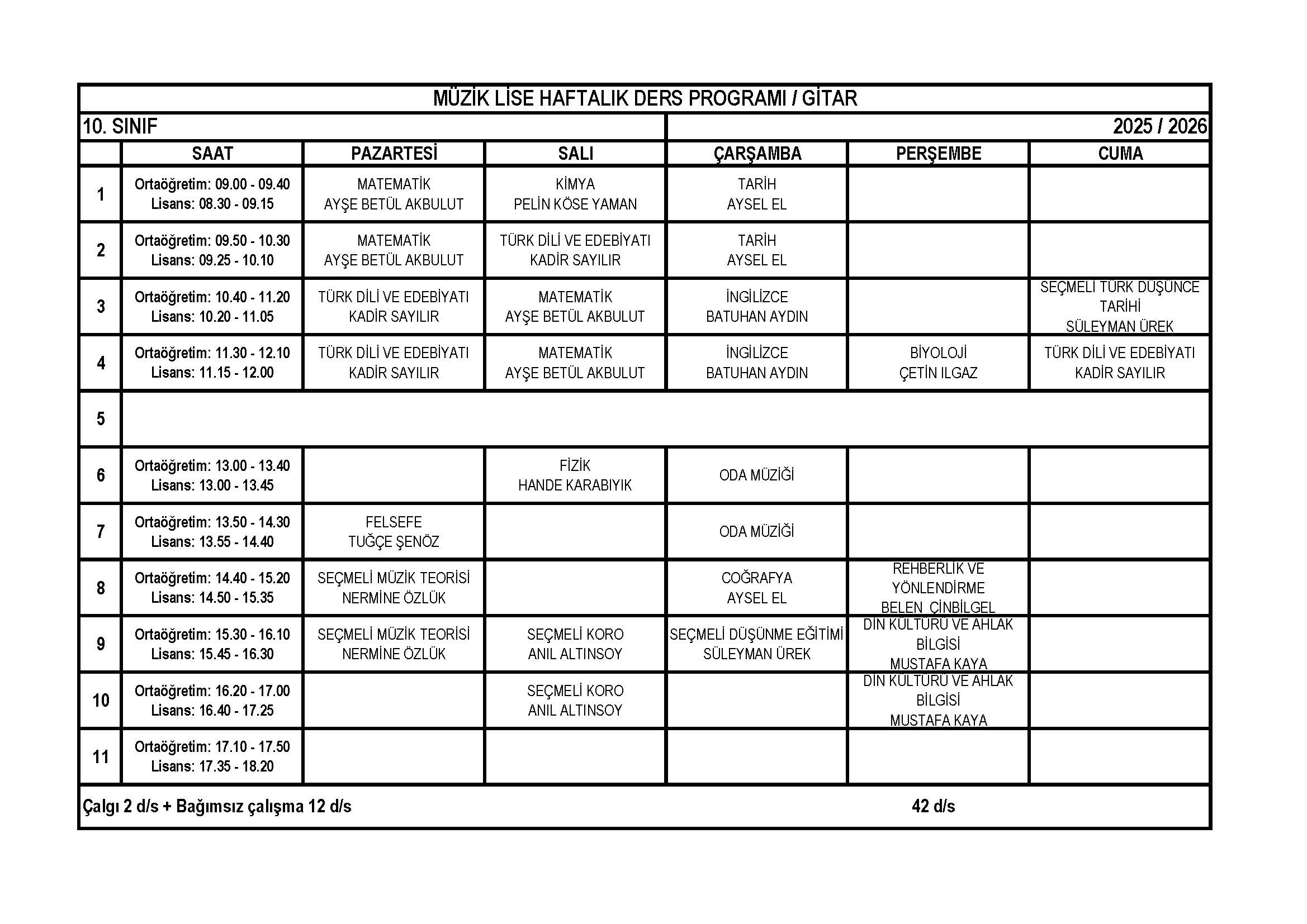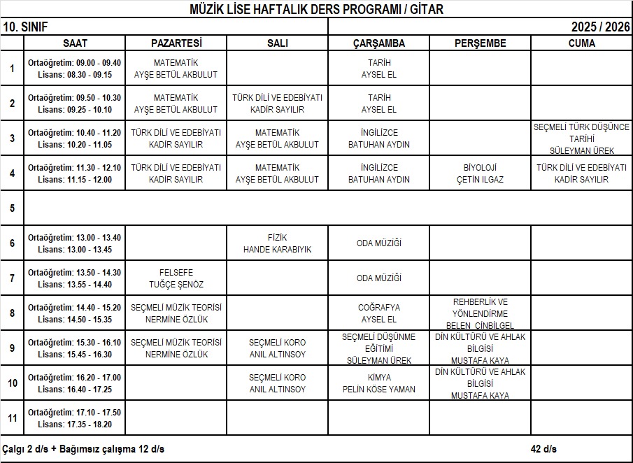 Gitar Lise 10. Sınıf Haftalık Ders Programı