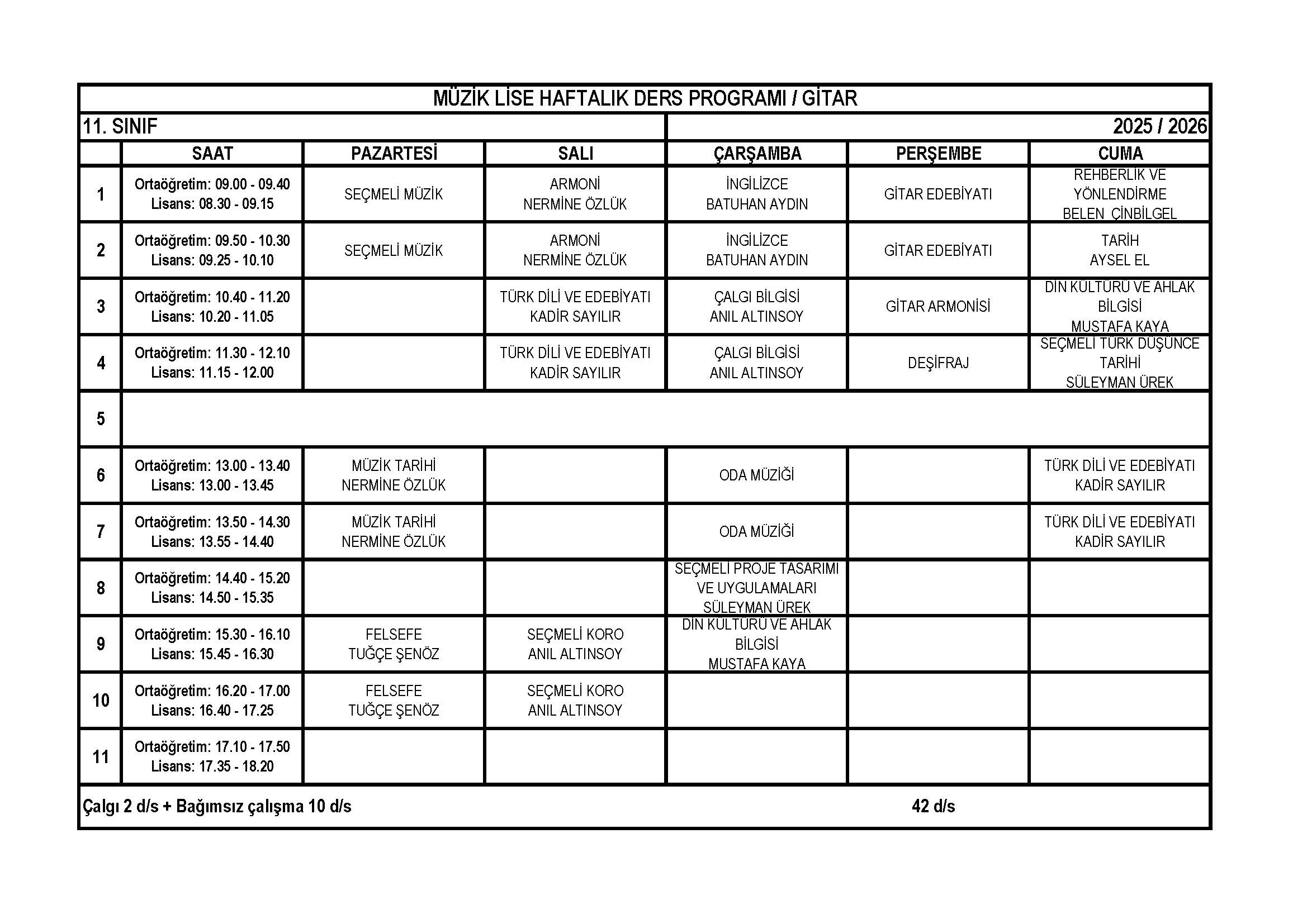 Gitar Lise 11. Sınıf Haftalık Ders Programı