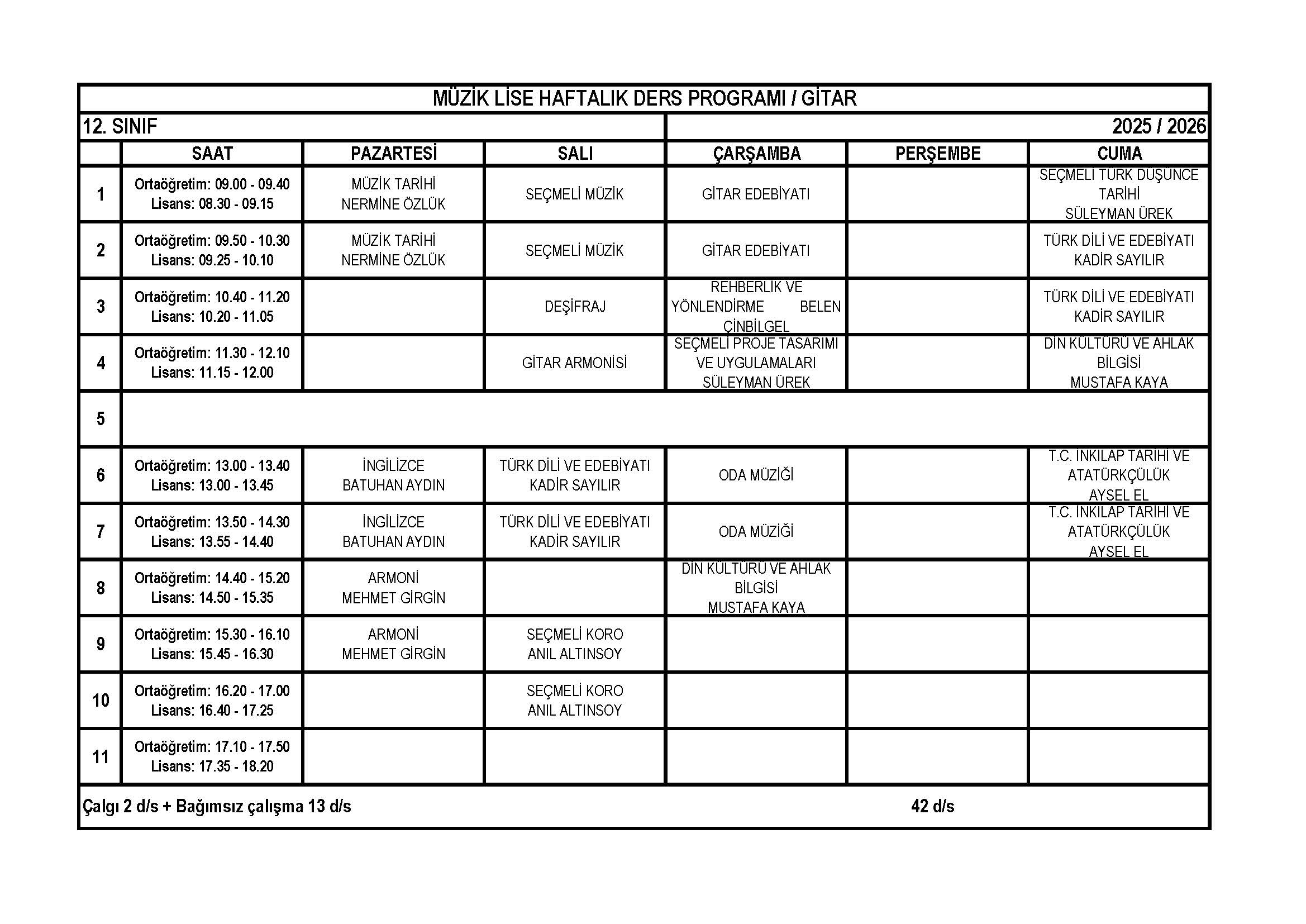 Gitar Lise 12. Sınıf Haftalık Ders Programı