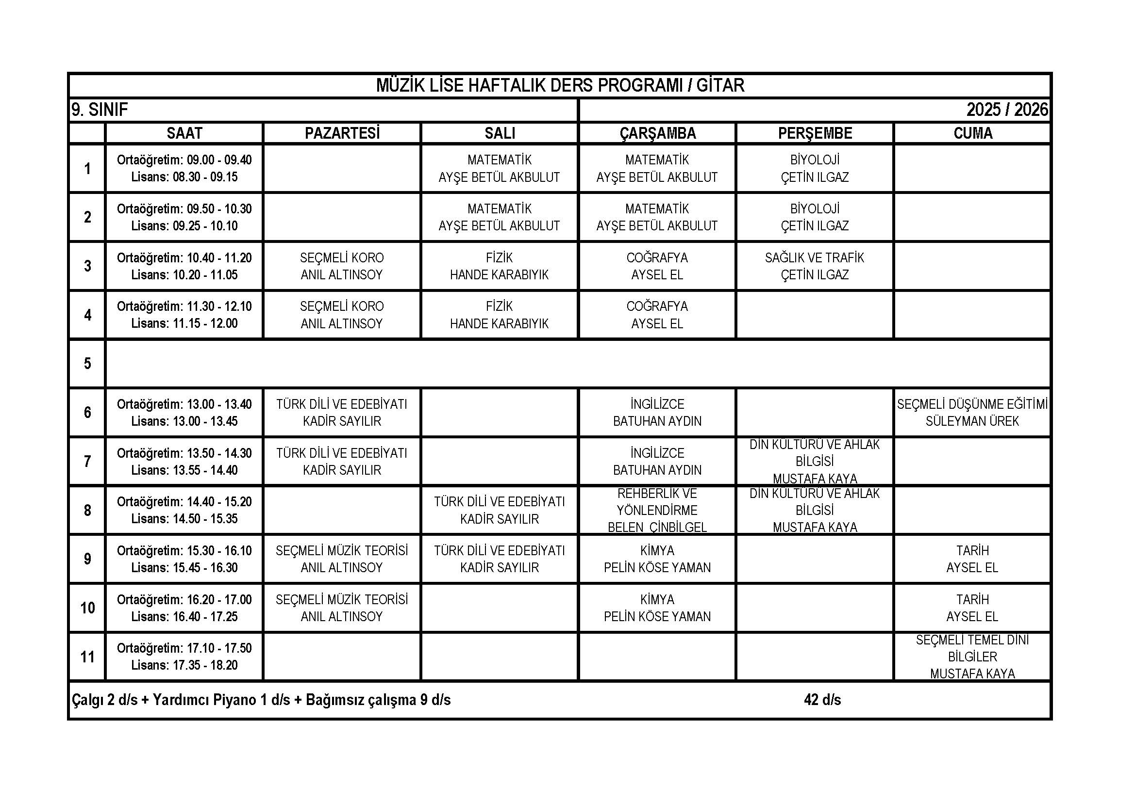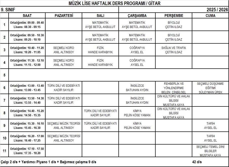 Gitar Lise 9. Sınıf Haftalık Ders Programı