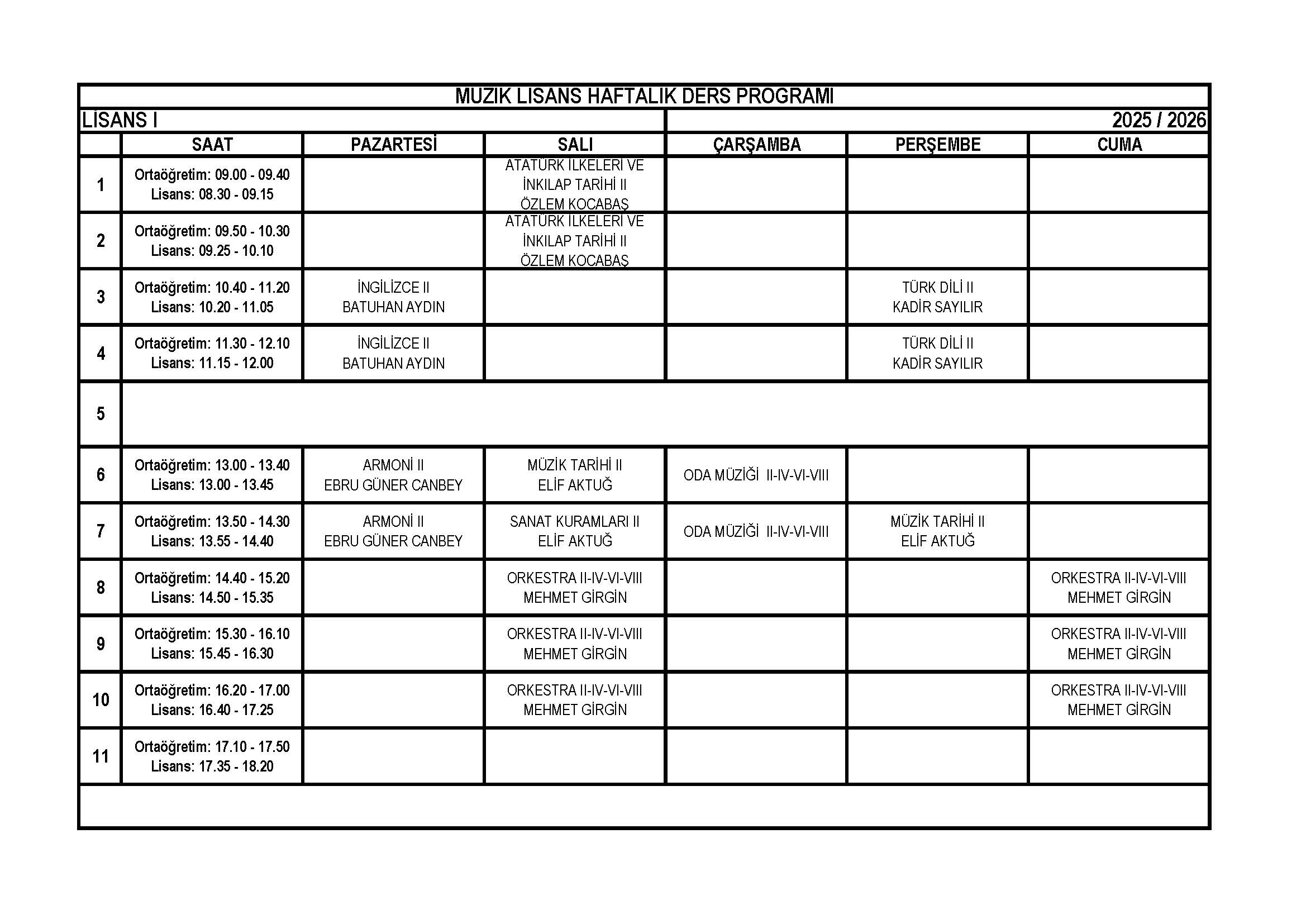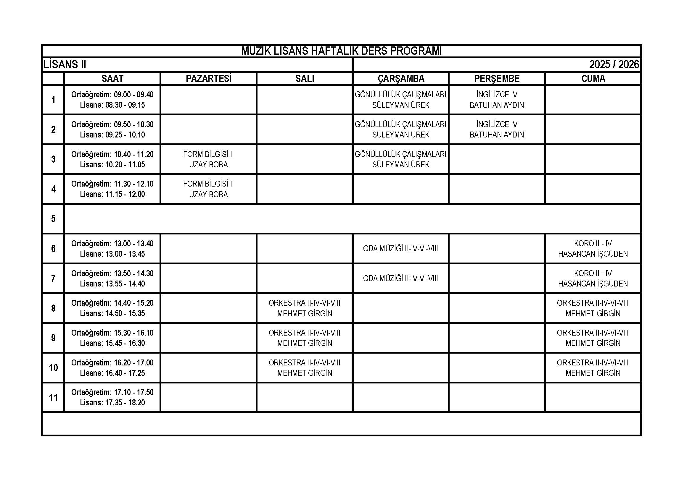 Müzik Bölümü Lisans 2. Sınıf Haftalık Ders Programı