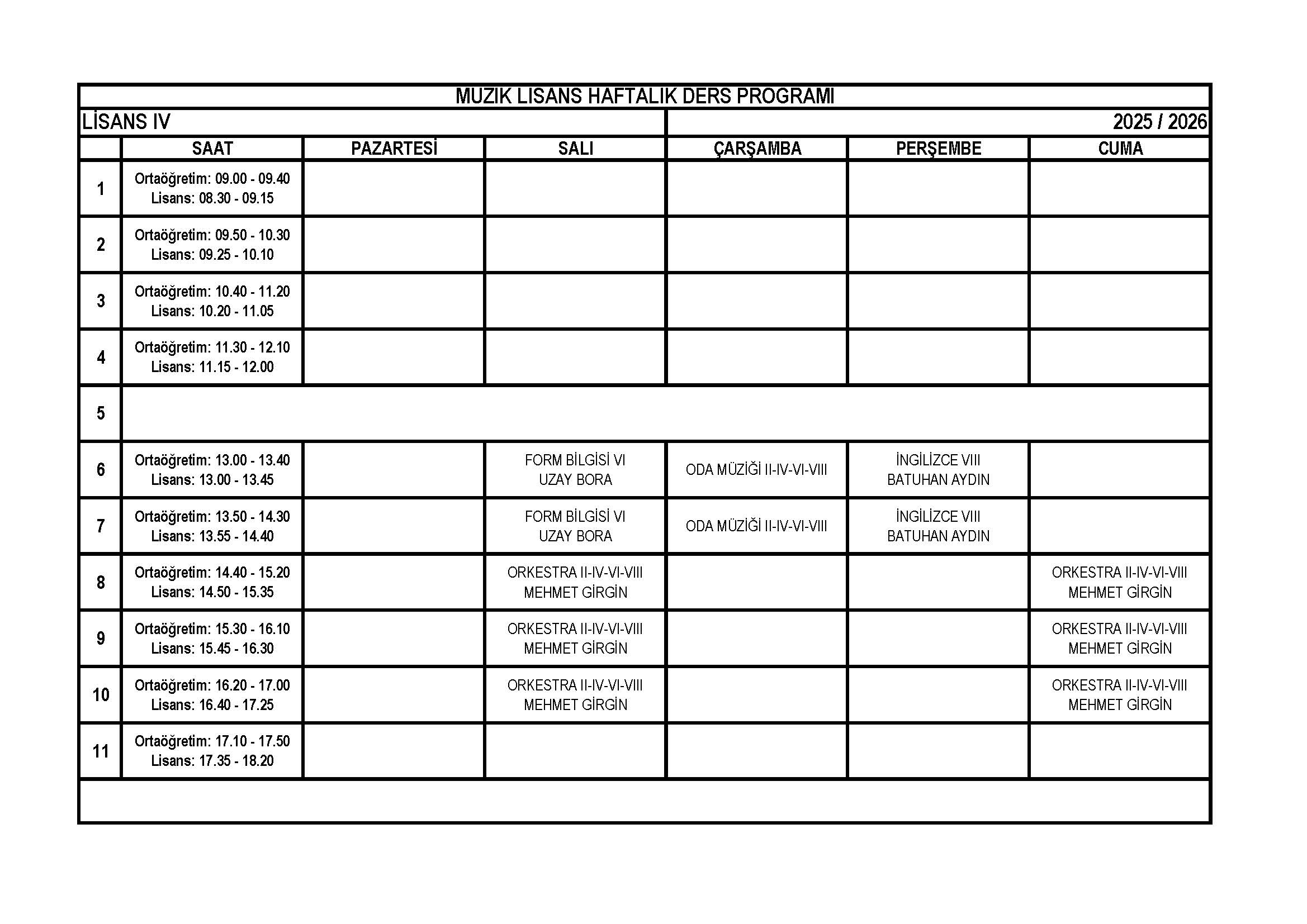 Müzik Bölümü Lisans 4. Sınıf Haftalık Ders Programı