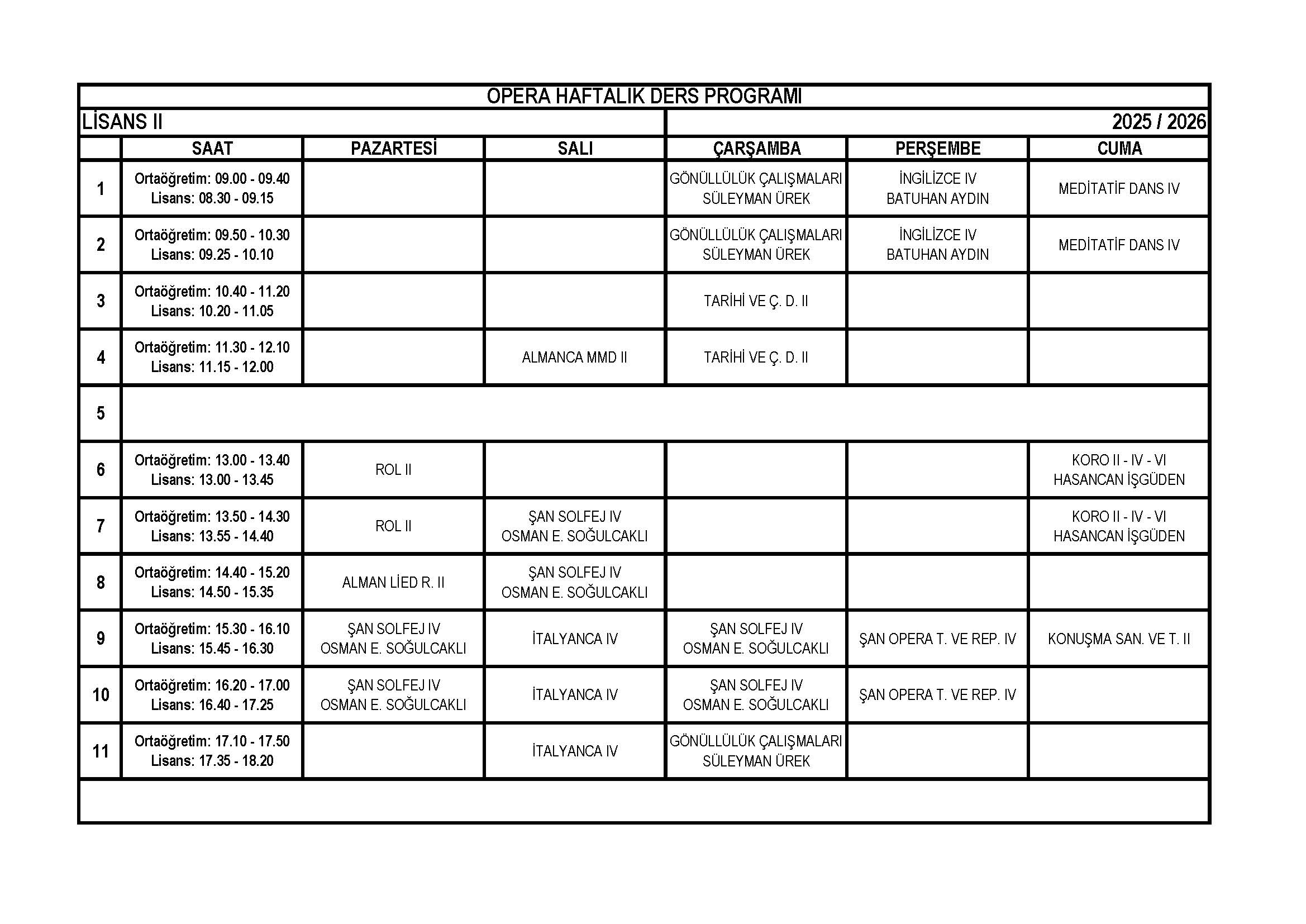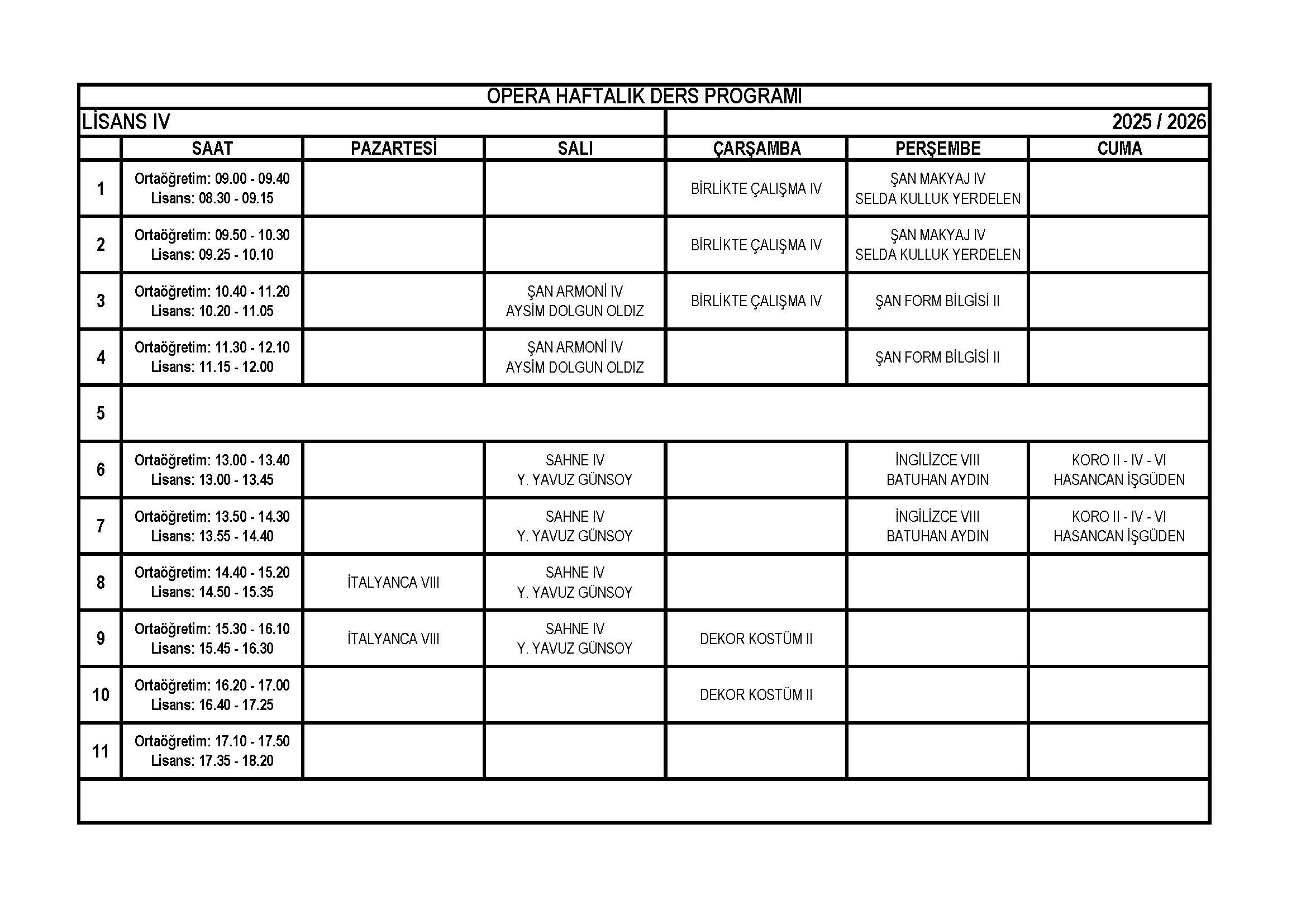 Opera Lisans 4. Sınıf Haftalık Ders Programı