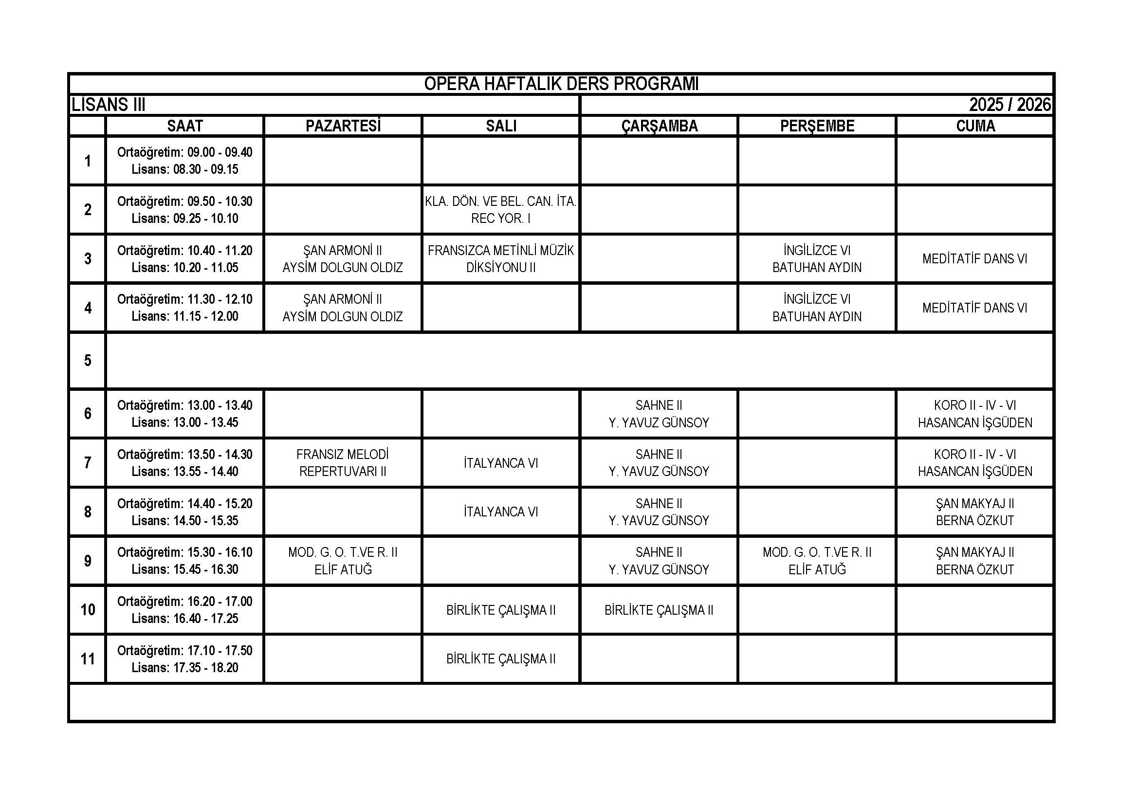 Opera Lisans 3. Sınıf Haftalık Ders Programı