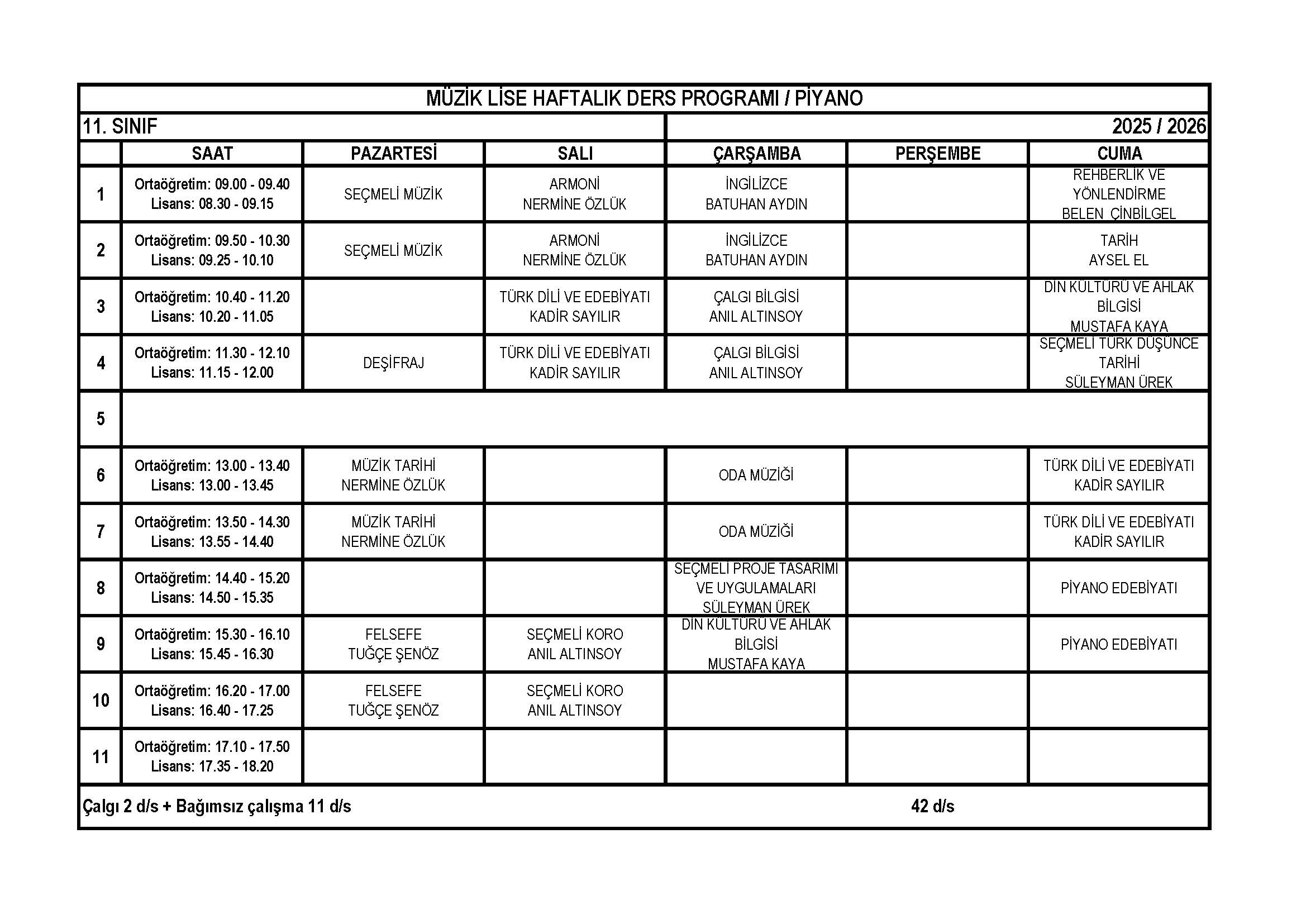 Piyano Lise 11. Sınıf Haftalık Ders Programı