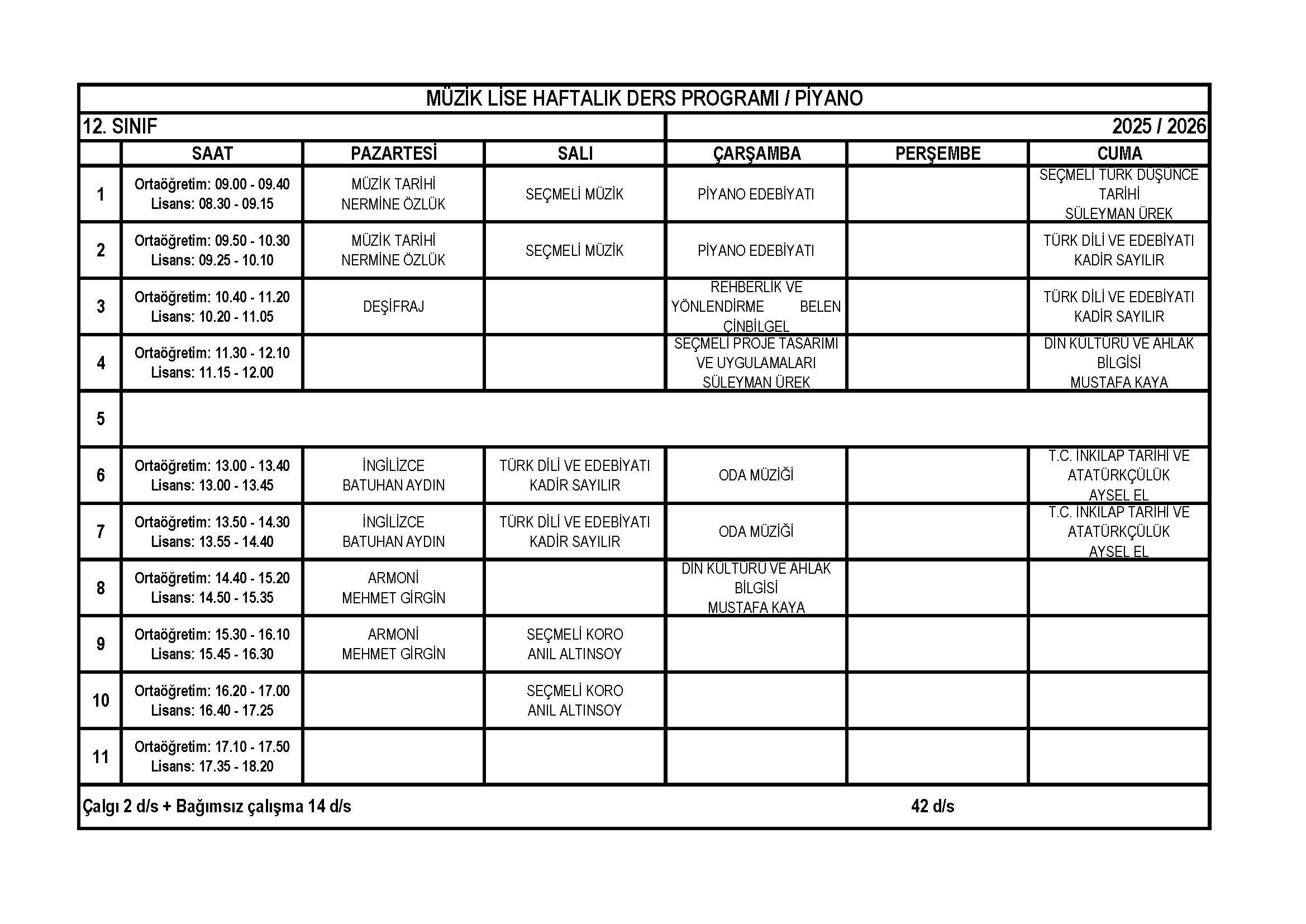 Piyano Lise 12. Sınıf Haftalık Ders Programı