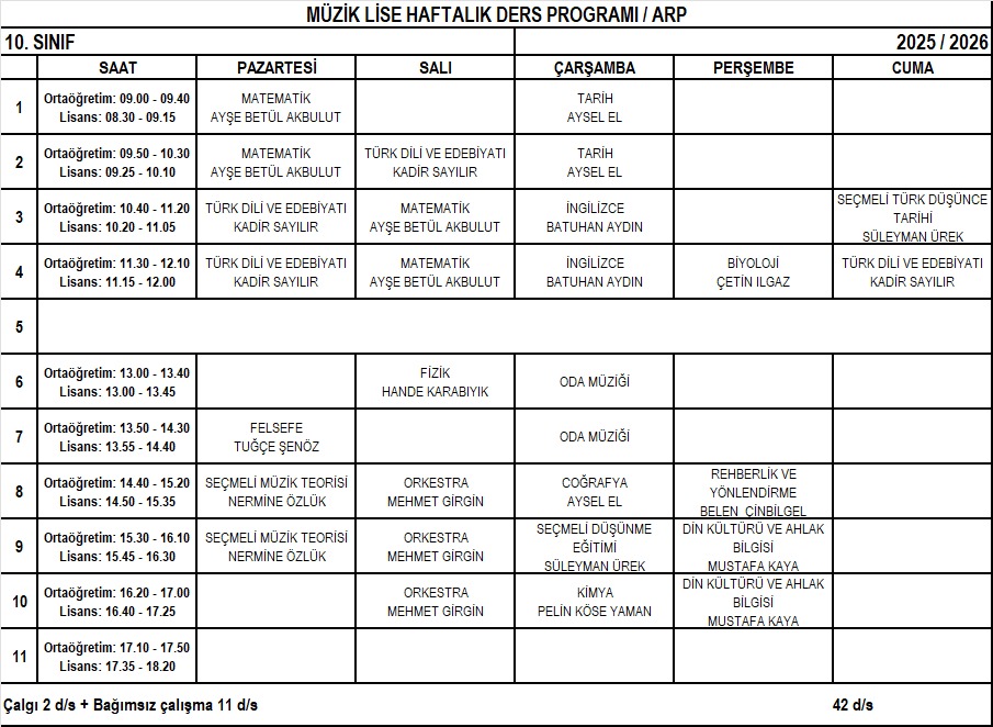Arp Lise 10. Sınıf Haftalık Ders Programı