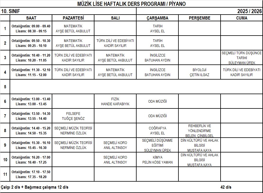 Piyano Lise 10. Sınıf Haftalık Ders Programı