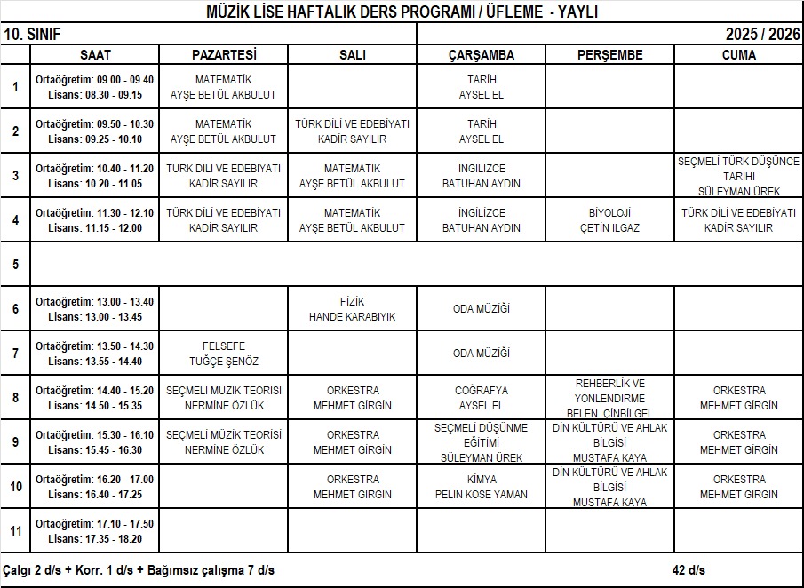 Üfleme – Yaylı Lise 10. Sınıf Haftalık Ders Programı