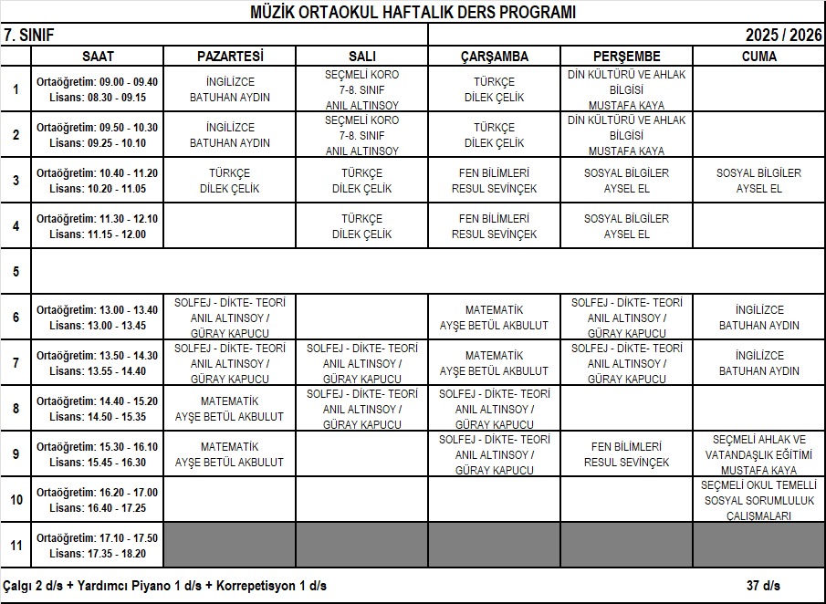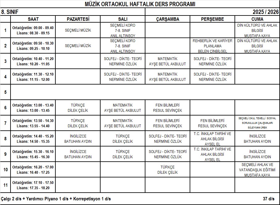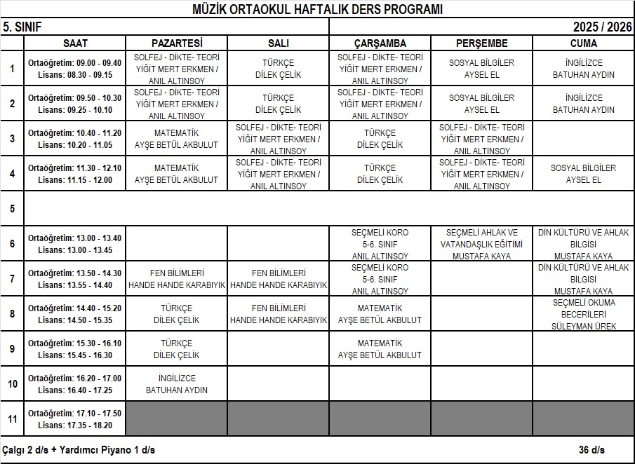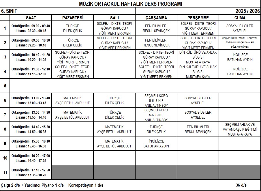 MÜZİK VE BALE ORTAOKULU HAFTALIK DERS PROGRAMLARI